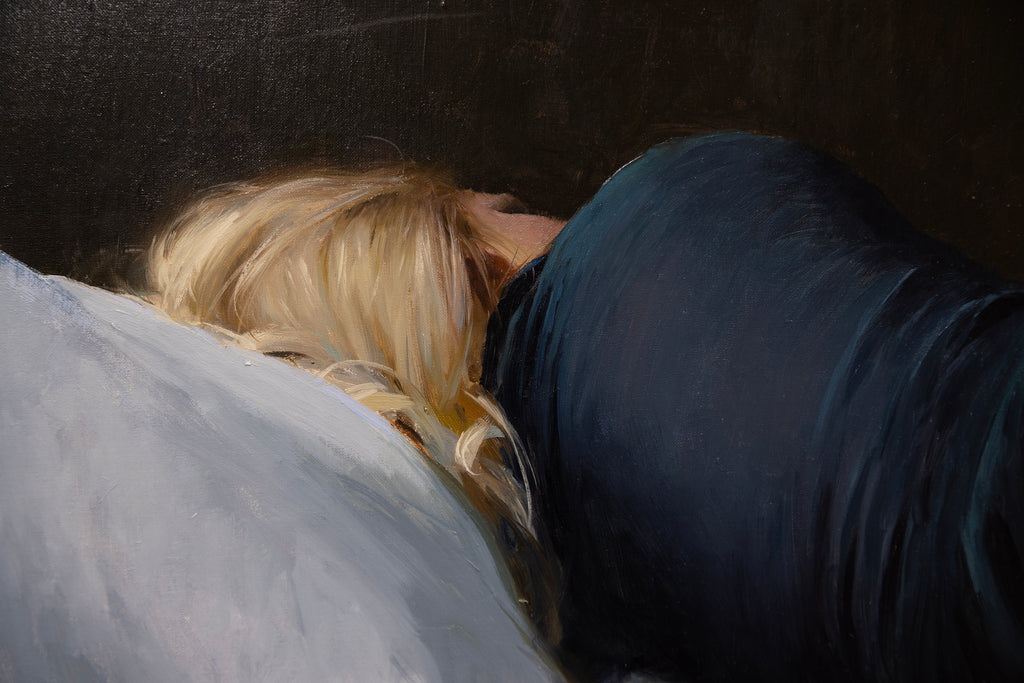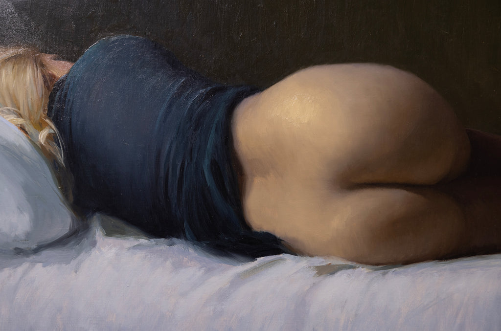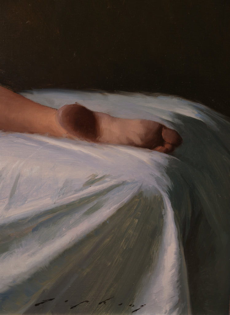 A classic original oil painting of a reclining nude figure by Jeremy Lipking. Framed dimensions 27 x 49 inches. Framed in a custom flat black moulding with gold leaf inner lip. Signed lower right.