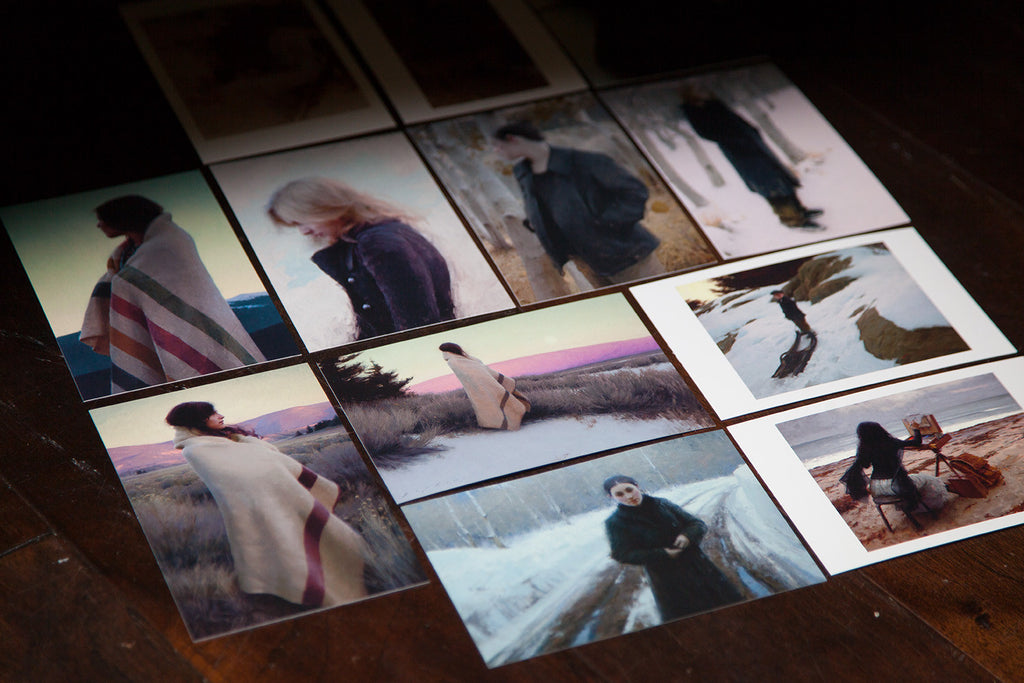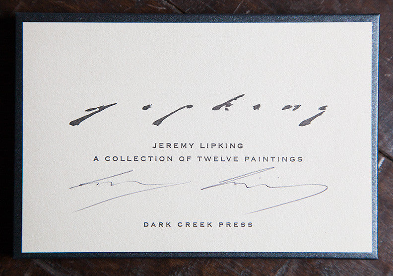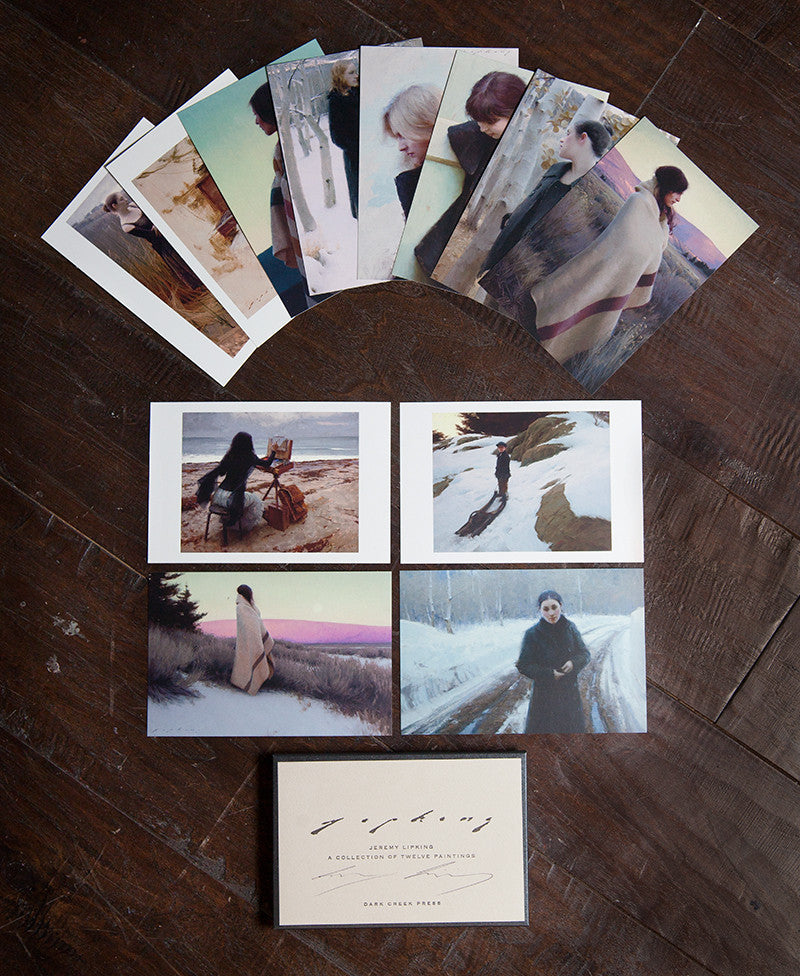 A portfolio of twelve quality postcard size reproductions of outdoor figurative paintings by artist Jeremy Lipking. The set comes in a beautiful custom handcrafted letterpress printed envelope made with fine art paper. Each reproduction is printed on 4"x6" heavyweight coated matte paper.