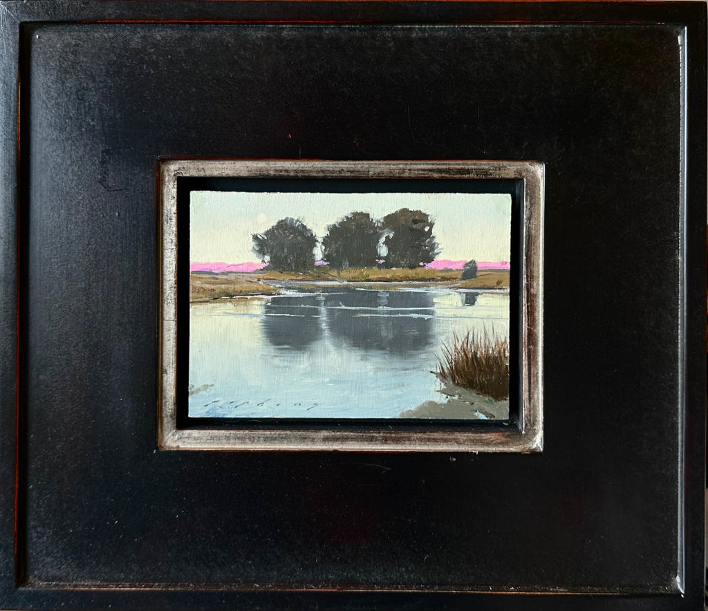 The piece showcases a tranquil water scene, with the soft reflections of trees mirrored against the still surface of the creek. Subtle hues of dawn or dusk—muted skies with glowing undertones of pink and gold—bring a sense of fleeting magic to the composition. The immediacy of the brushwork conveys the authenticity of plein air painting, allowing viewers to feel as if they are standing on the creek’s edge, immersed in its quiet rhythm.